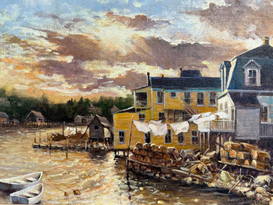 Robert Luvall Sea Breeze Sunlit Harborside Town Oil Painting in Gold Frame