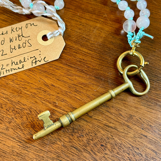 Antique Brass Key and Rose Quartz Beaded Hand Knotted Necklace