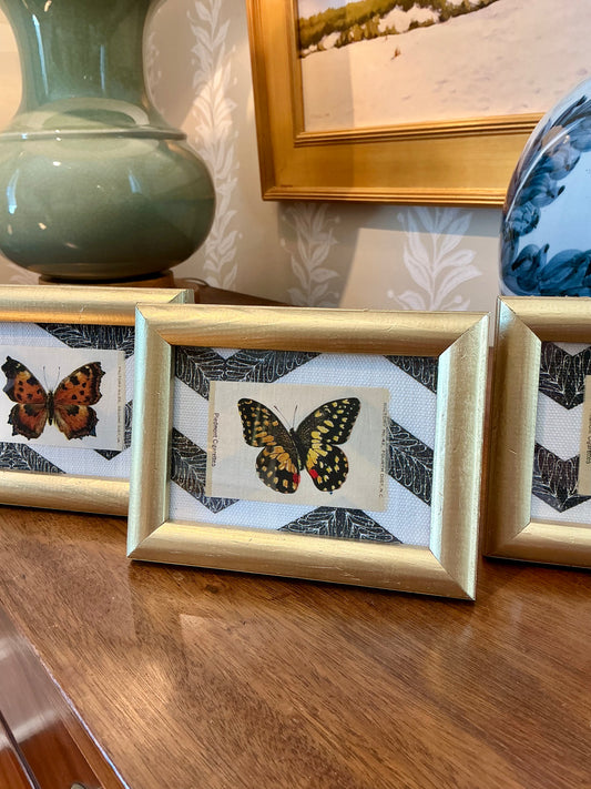 Set of Three Antique Butterfly Tobacco Silks on Black and White Zigzag in Gold Frames