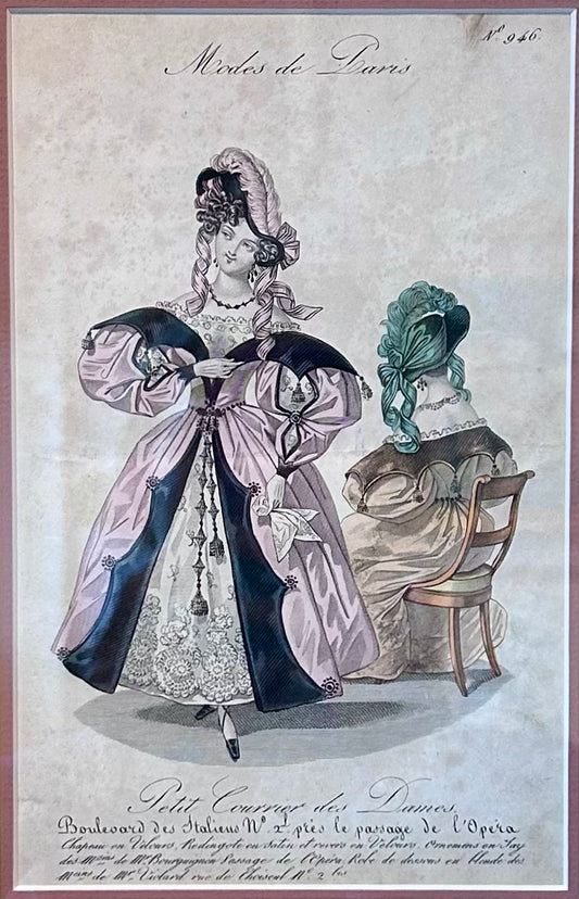 Early 19th c. Hand Colored Modes de Paris French Fashion Engraving in Vintage Gold Berries Frame