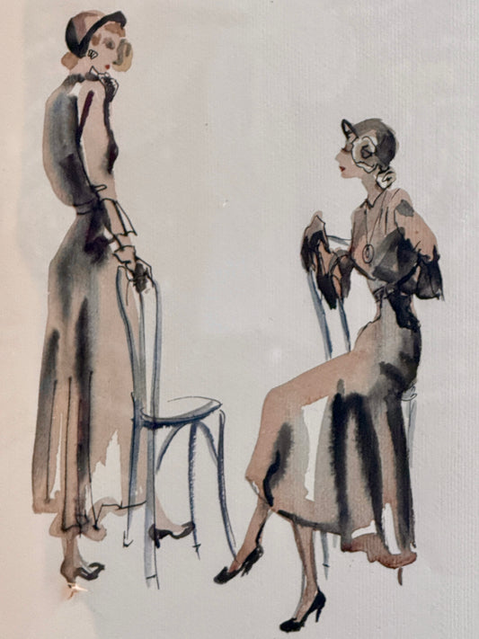 Catherine Figart Vogue Watercolor Fashion Illustration on Blue Block Print Floral in Gold Frame