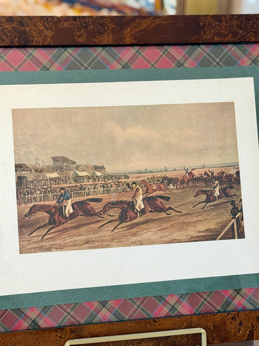 Pair of 19th Century 1839 Steeplechase Aquatint on Ralph Lauren Red Green Tartan Plaid in Burlwood Frames