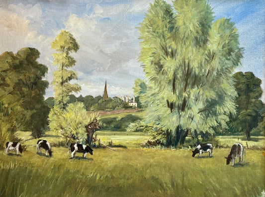 Ronald Pardue Country Landscape with Cows Oil Painting in Gold Frame
