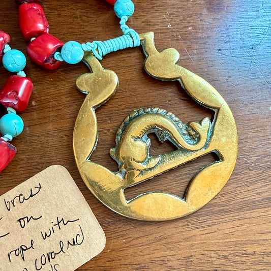 Antique English Horse Brass Fish Medallion Red Bamboo Coral and Turquoise Beaded Hand Knotted Necklace