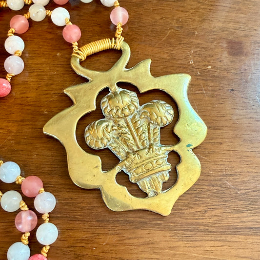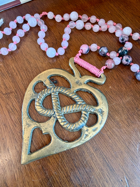 Antique English Horse Brass Heart Knot Medallion Rose Quartz and Rhodonite Beaded Hand Knotted Necklace