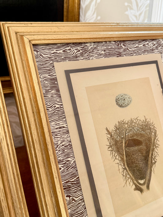 Pair of 19th Century Hand Colored Egg Lithographs on Brown Faux Bois in Vintage Gold Frames