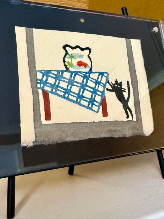 Vintage Folk Art Cat Fishbowl Watercolor Painting in Acrylic on Black Easel