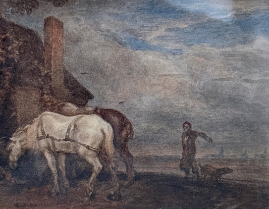 Manner of Philips Wouwerman (1619-1668) 19th Century Watercolor Horses at Rest in Floral Gold Frame