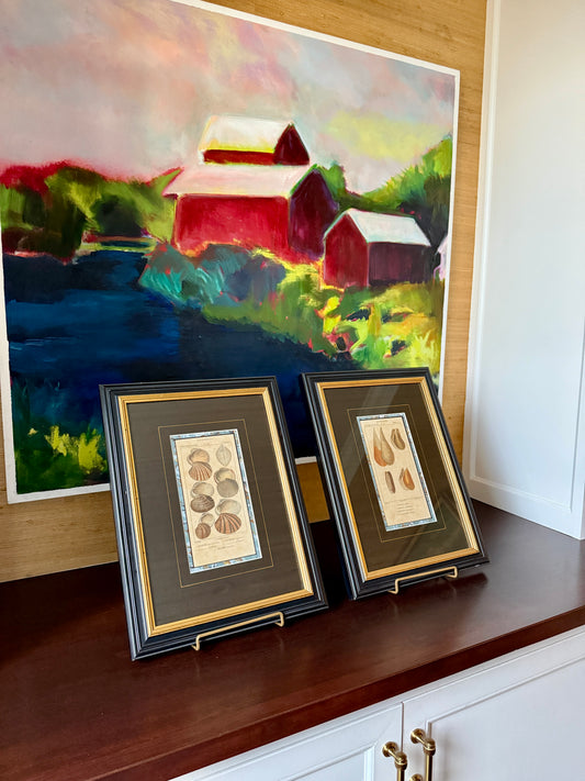 Pair of Pierre Turpin Hand Colored Seashell Lithographs in Black and Gold Frames