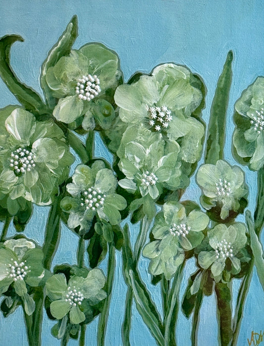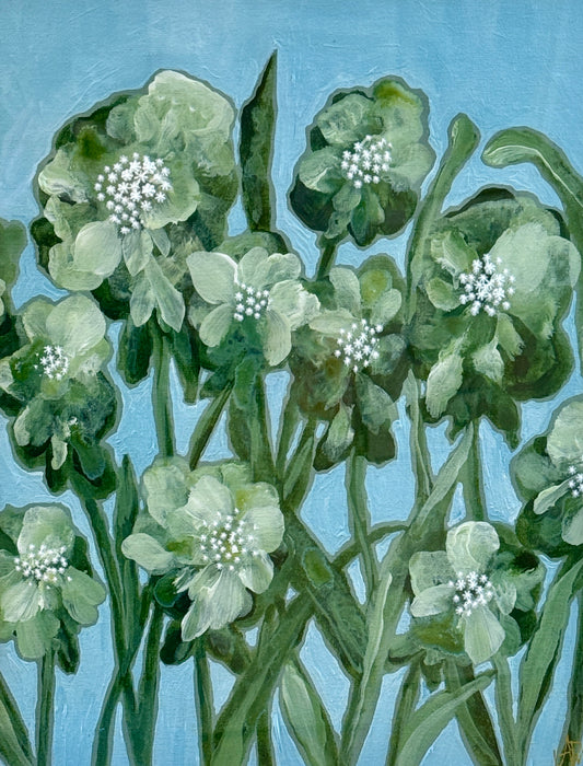 Alison Diamond McElroy Green Interval II Abstract Floral Painting in Gold Bamboo Frame