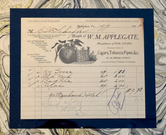 1908 W.M. Applegate Cigar Shop Receipt on Hand Marbled Paper in Vintage Gold Frame