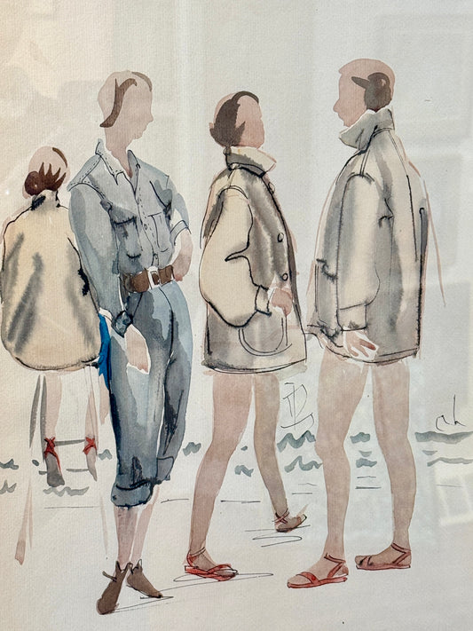 • Catherine Figart Vogue Watercolor Coastal Fashion Illustration on Serena and Lily Blue Pinstripe Fabric in Vintage Gold Frame