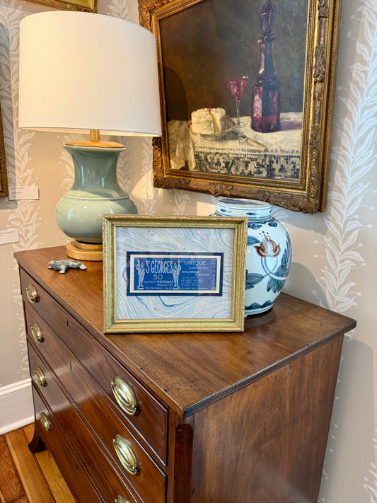 Antique Saint Georges Unique Curiosities Paris France Advertisement Card on Blue Marbled Mount in Gold Frame