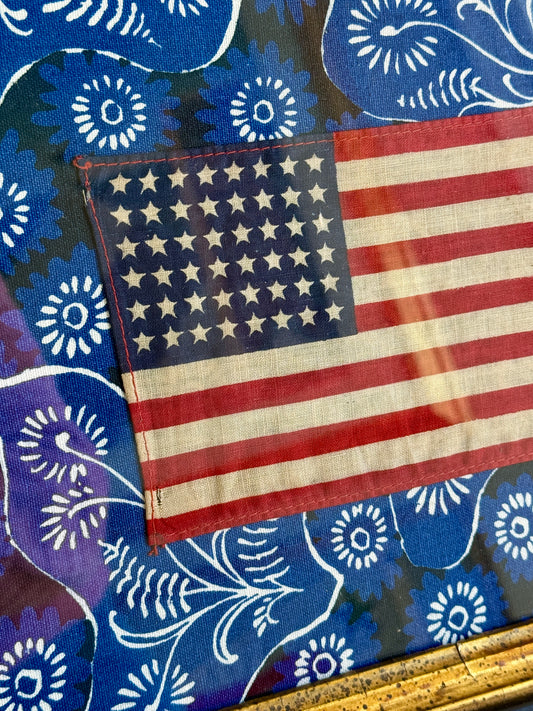 48 Star American Flag on Blue Floral Brunschwig & Fils in 19th Century Wood and Gilded Frame