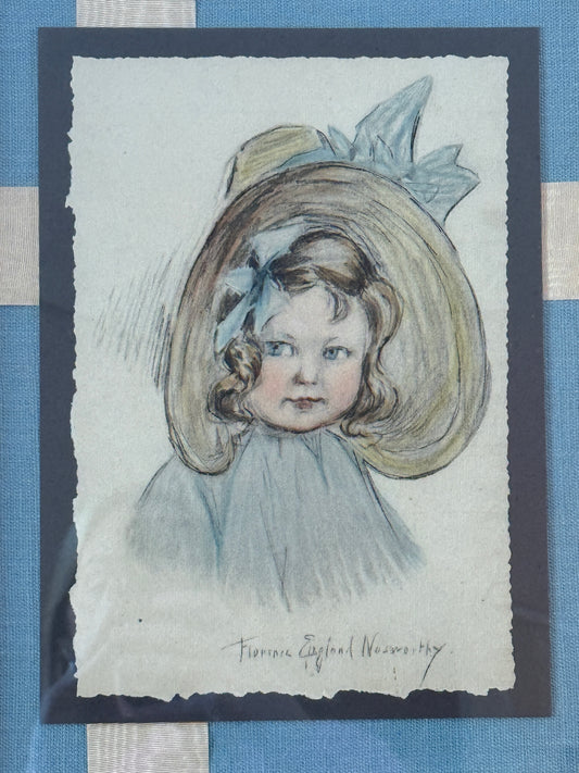 Florence Norworthy Pastel Portrait of Girl in Sun Hat with Bow in Ornate Gold Frame