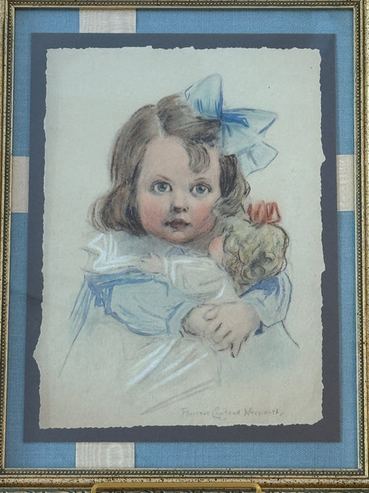 Florence Norworthy Pastel Portrait of Girl and Baby Doll in Blue Bow on Light Blue Twill and Watered Silk in Ornate Gold Frame