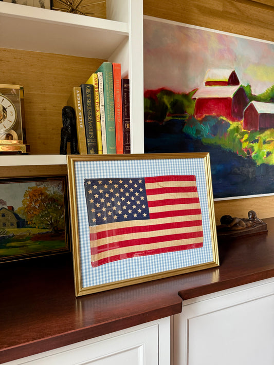 Vintage 50 Staggered Star American Flag on Light Blue Gingham Fabric in Gold Frame
