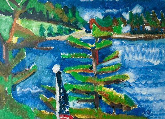 Deborah Beckwith Winship Monhegan Harbor Maine Abstracted Seascape with Sailboat Oil in Gold Frame
