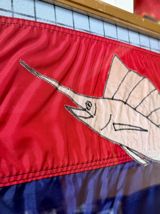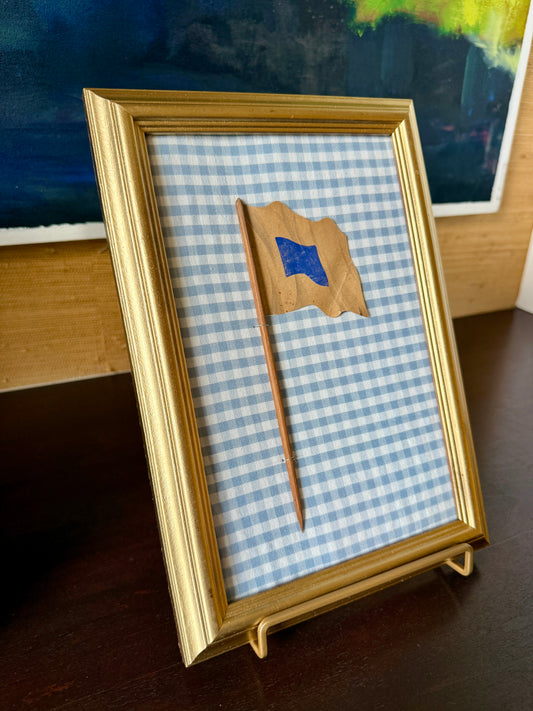 Vintage Sailfish Capture Trophy Flag on Blue Windowpane Check Fabric in Gold Frame