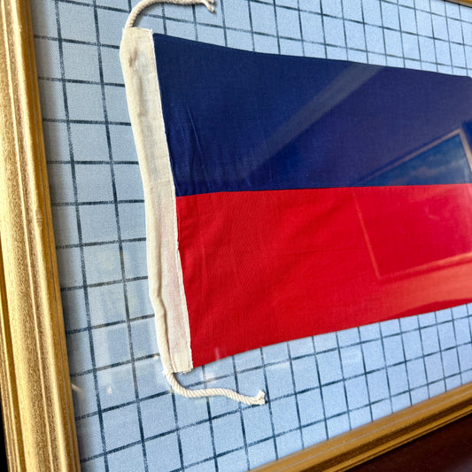 Vintage Canvas Nautical Signal Flag for "E" on Blue Windowpane Check in Gold Frame