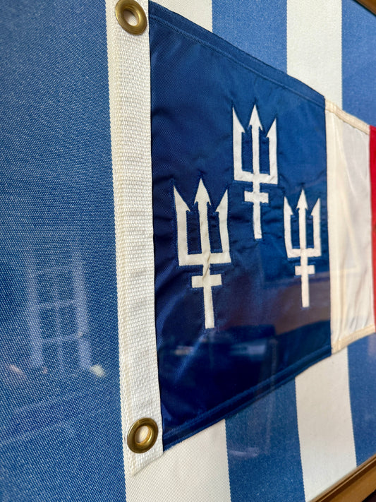 Vintage United States Power Squadron Boston Yacht Club Commander Trident Flag Mounted on Blue Stipes in Gold Frame