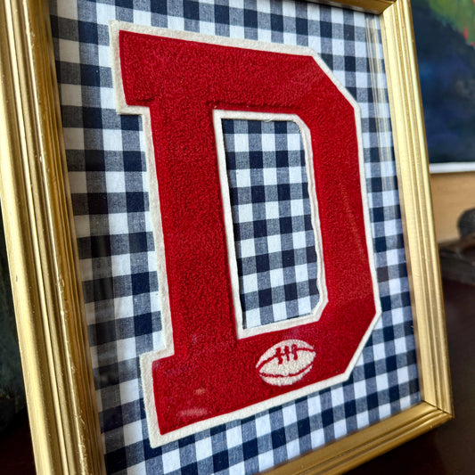 Vintage Large Varsity Football Initial Letter "D" on Black Gingham Fabric in Gold Frame