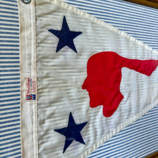 Vintage Red and White Stitched Star Canvas Nautical Burgee on Blue Ticking Stripes in Gold Frame