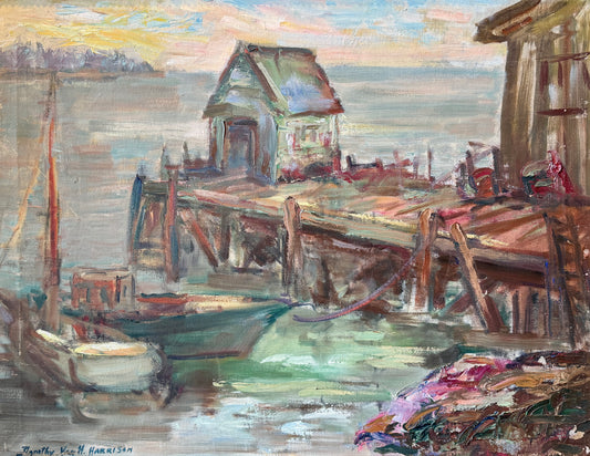 Dorothy Van Houten Harrison Evening in Maine Harborscape Oil Painting in Gold Beaded Frame