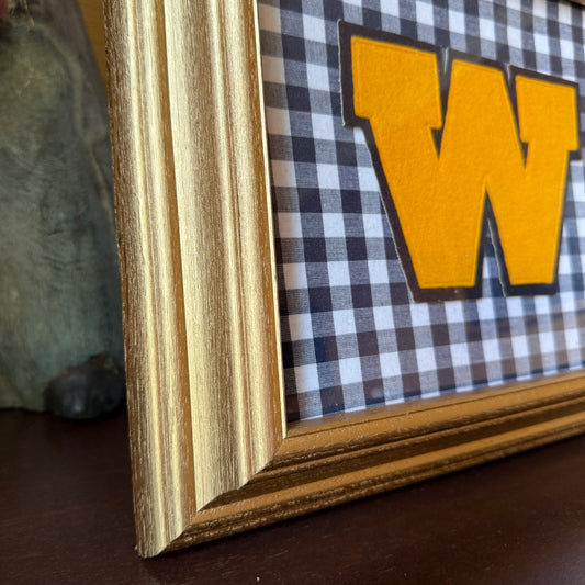 Vintage Large Varsity Initial Letter "W" on Navy Blue Gingham in Gold Frame