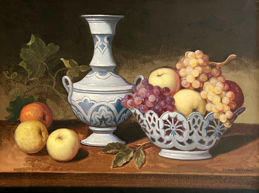 Juan Antonio Fruit in Blue and White Porcelain Still Life Oil Painting in Custom Frame