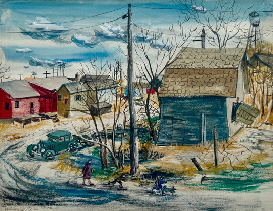 1942 Americana Townscape Out of My Window Watercolor Painting in Gilded Wood Frame