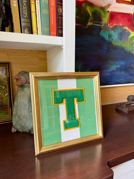 Vintage Large Varsity Initial Letter "T" on Green Awning Striped Fabric in Gold Frame