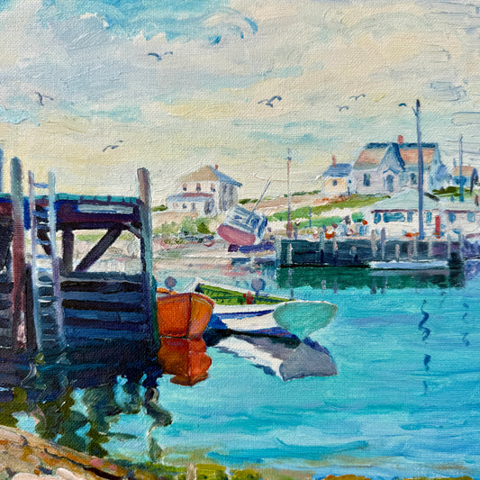 Knox Everson New England Harborscape View from Under the Pier Oil Painting in Gold Frame