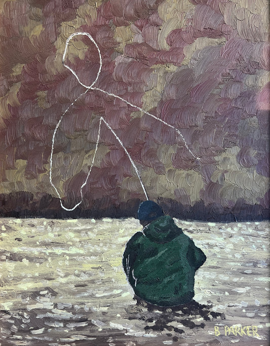 Contemporary Fly Fisherman Morning Catch Oil Painting Portrait in Gold Frame