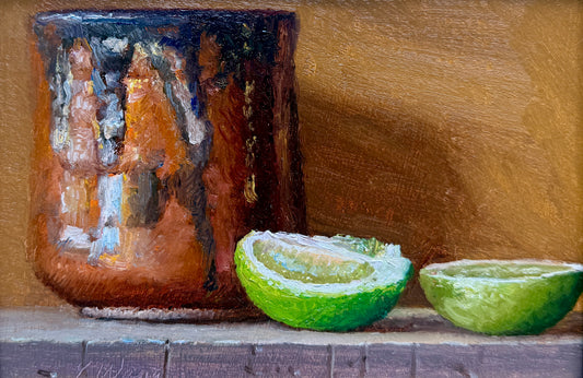 Copper Mug with Limes Still Life Oil Painting in Gold Frame