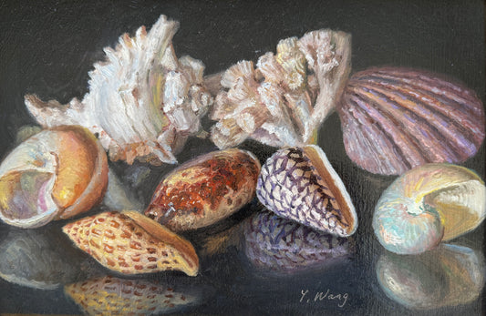 Contemporary Menagerie of Seashells and Coral Still Life Oil Painting in Gold Frame