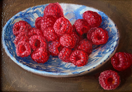Contemporary Raspberries in Blue and White Bowl Still Life Oil Painting in Gold Frame