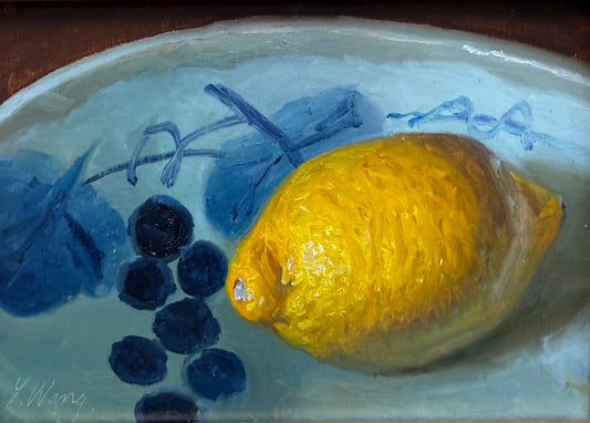Contemporary Lemon in Blue and White Bowl Still Life Oil Painting in Gold Frame