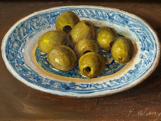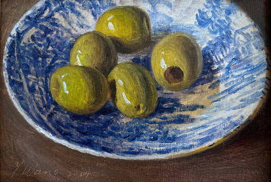 Contemporary Still Life of Green Olives in Blue Willow Bowl in Gold Frame