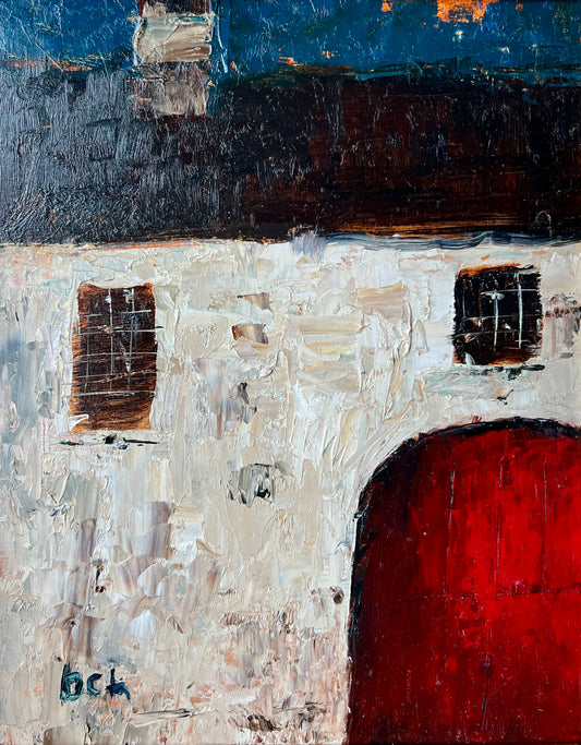 Contemporary Expressionist Red Barn Door Oil Painting in Gold Frame