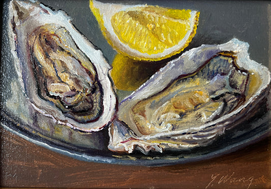 Contemporary Oysters and Lemons Still Life Oil Painting in Gold Frame