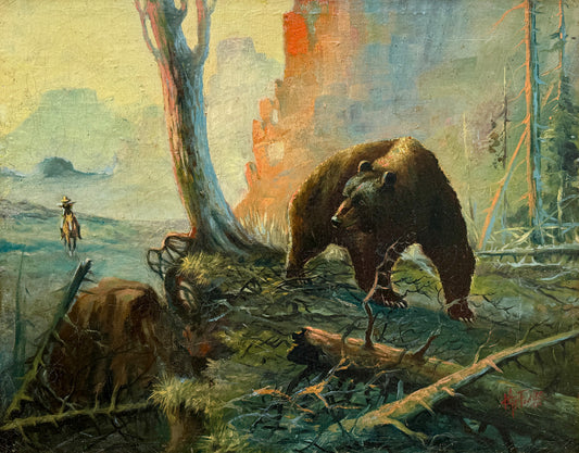 Early 20th c. American West Cowboy v. Bear Oil Painting in Gold Frame