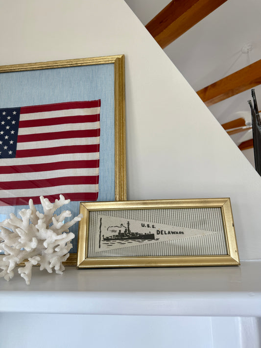Early 20th Century U.S.S. Delaware Naval Ship Wool Pennant on Light Blue Herringbone in Gold Frame