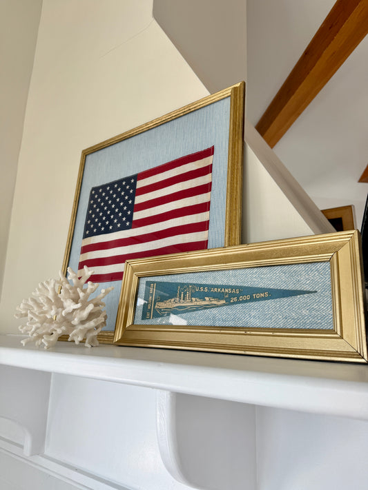 Early 20th Century U.S.S. Arkansas Naval Ship Wool Pennant on Blue Herringbone Fabric in Gold Frame