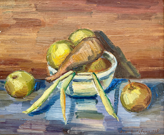 1935 Expressionist Still Life of Apples, Carrots and Peas in Wood Frame