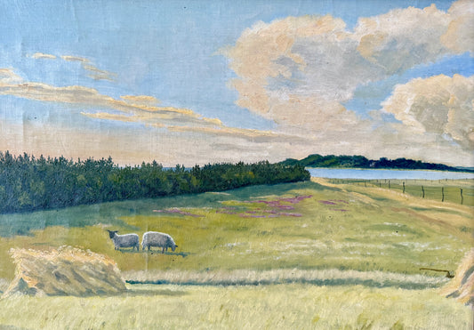 1933 Coastal Farm Landscape with Sheep Oil Painting in Gold Frame