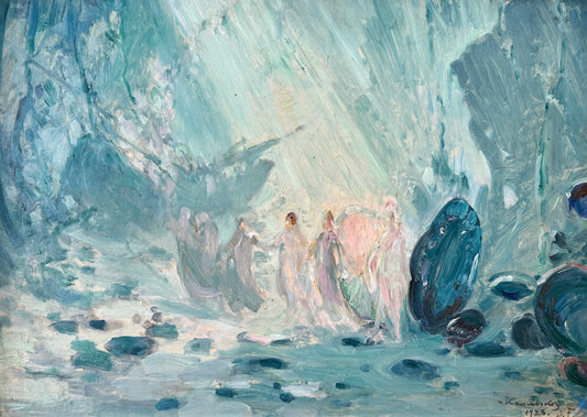 1923 Impressionist Women in Landscape / Under Seascape Oil painting in Black Gold Frame