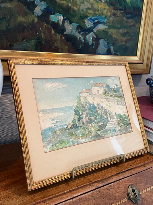 1930 Italian Coastal Landscape Watercolor Painting in Gold Frame