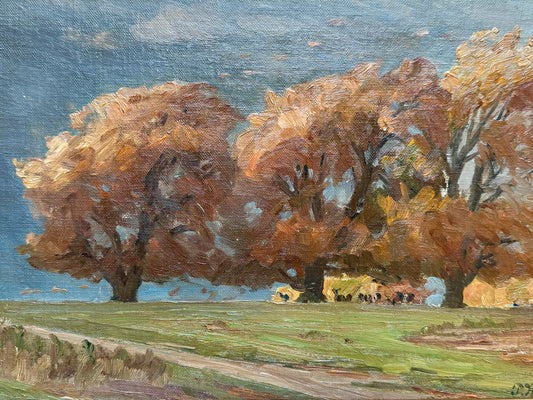 1934 Swirling Clouds Over Farmhouse Landscape Oil Painting in Gold Frame