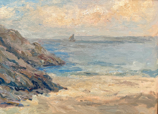 1934 Impressionist Coastal Landscape Seascape Oil Painting with Sailboat in Gold Frame